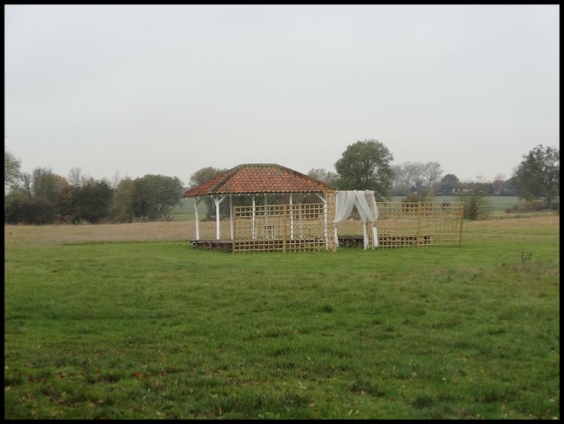 After skirting around a couple of field edges, I entered a meadow which contained this odd-looking structure - all by itself in the otherwise empty field. I presumed it was for local festivities of some sort … but not on this cold November morning.